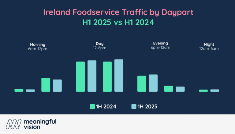 Meaningful Vision data shows Irish foodservice traffic down 3.8%. Morning dips, but Lunch holds. Afternoon and Evening are key growth engines.
