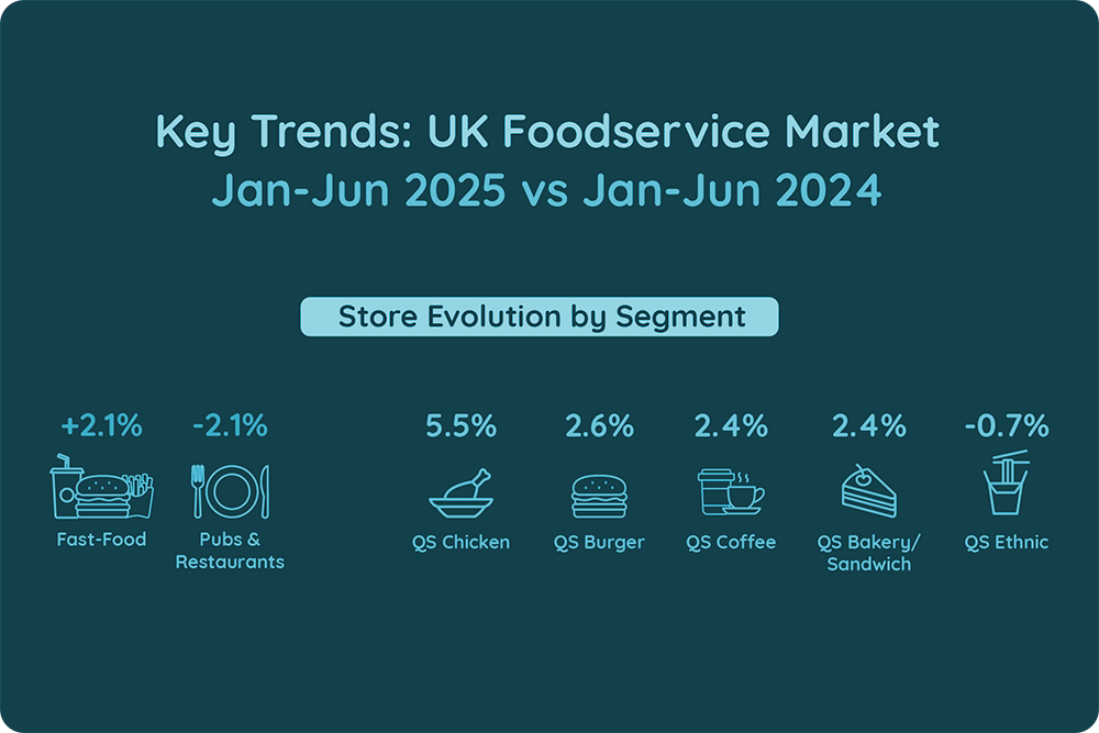 The Burger segment showed unusual consistency, holding at 2.6% growth and underlining the strength of established brands. Bakery and sandwich players added 2.4%, reflecting cautious infill strategies, while coffee matched that pace at 2.4%. Ethnic formats slowed sharply, advancing just 2.2%. The Pizza segment was the only one to contract, slipping into net closures at –0.7%, a sign of sustained pricing pressures and uneven returns across the category.